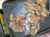 ホットプレートで熱々バクダン&チヂミを焼いてますよ。